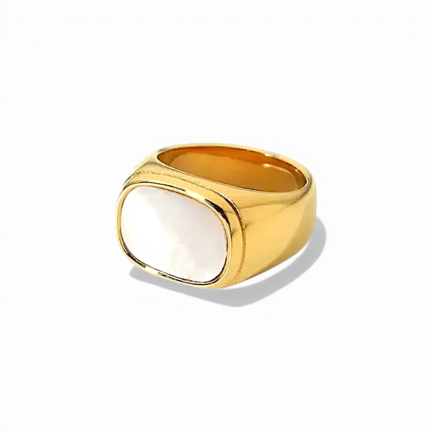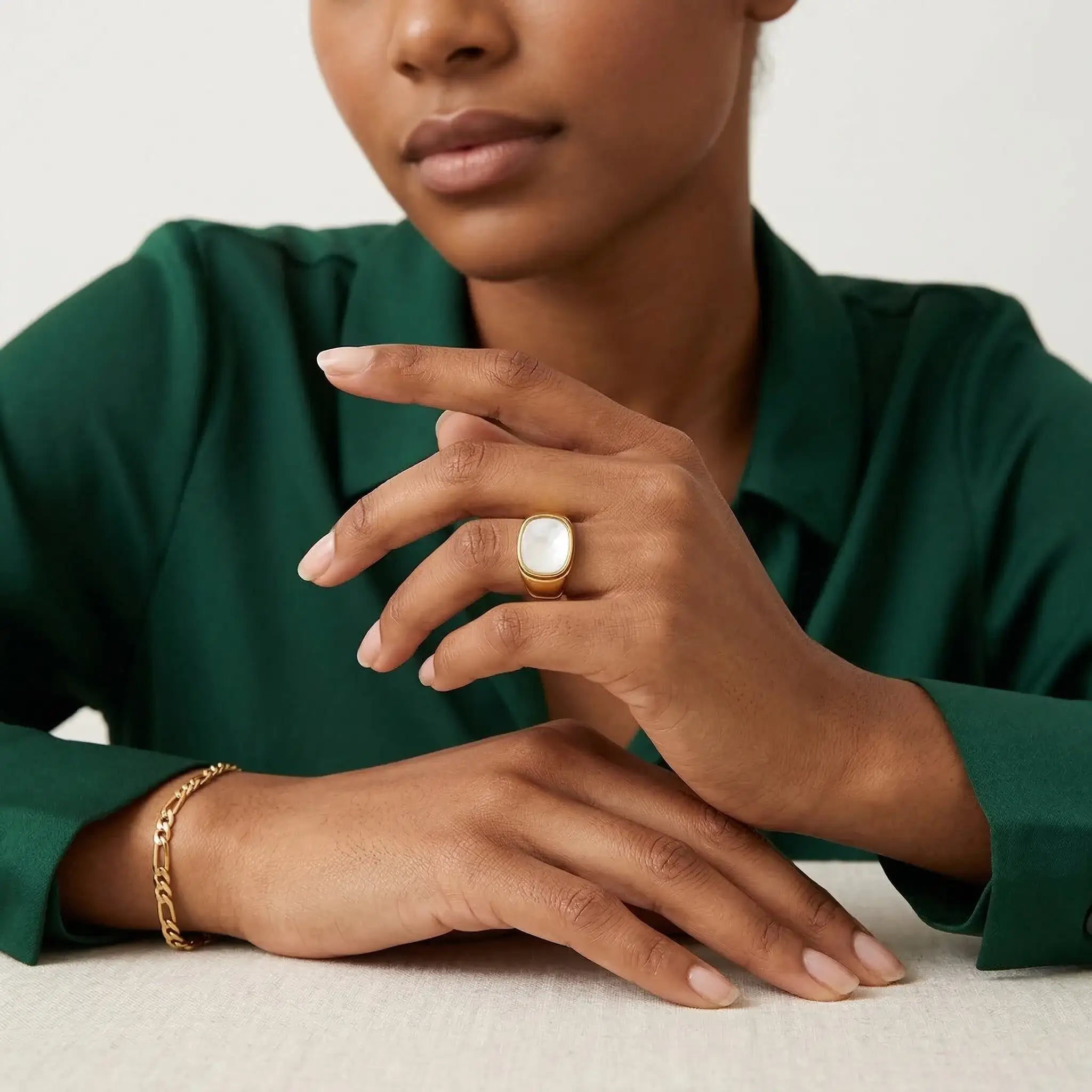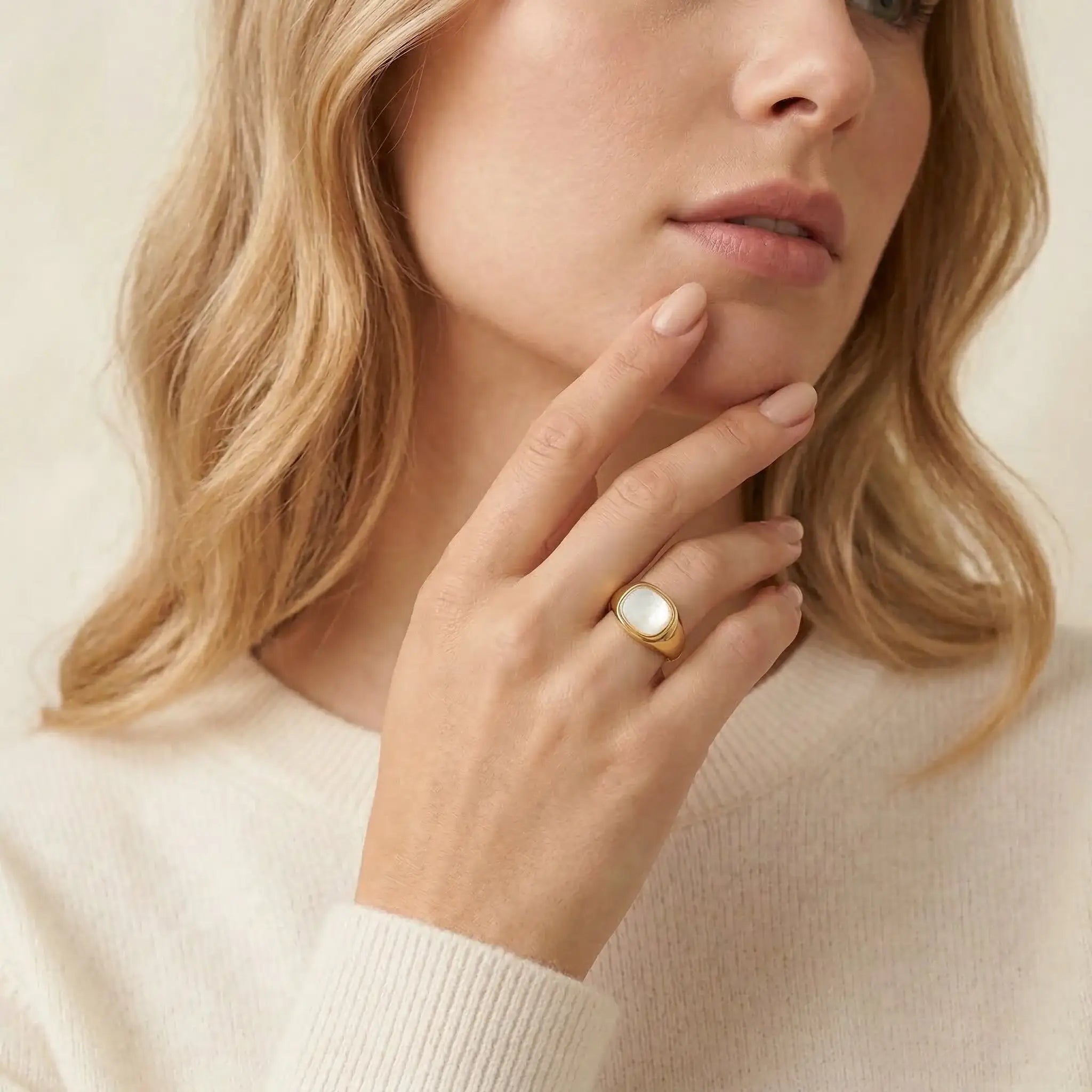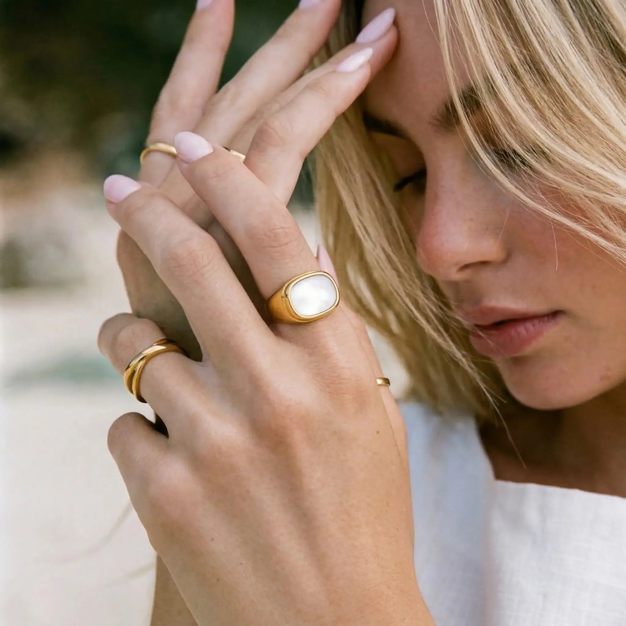 El anillo de concha Solara Gold añade un suave brillo a tu colección de joyas diarias. Su centro de concha suave capta la luz de manera hermosa y le da un aspecto limpio y pulido. Fácil de llevar todos los días, pero aún lo suficientemente especial para cenas, vacaciones y momentos más elegantes.
