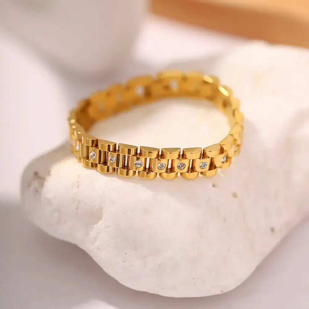 La pulsera de reloj Auralink Gold añade un estilo audaz y un acabado pulido a tu colección. Su forma de pulsera y su suave brillo la hacen sentir moderna, elegante y fácil de llevar. Perfecta para looks diarios cuando quieres algo fuerte y con estilo.